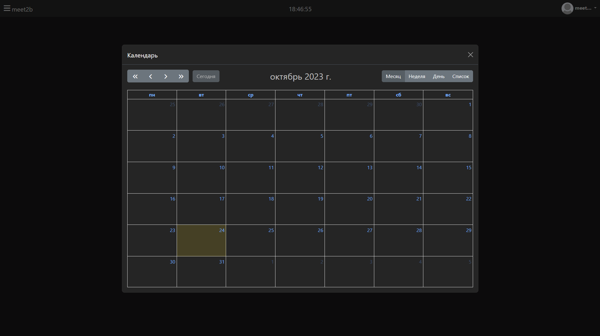 С помощью кнопок Месяц, Неделя и День пользователь может выбрать соответствующий временной интервал для отображения в календаре. Для перехода к другому интервалу нужно воспользоваться кнопками с пиктограммами в виде стрелок. Кнопка Сегодня позволяет перейти к текущей дате.