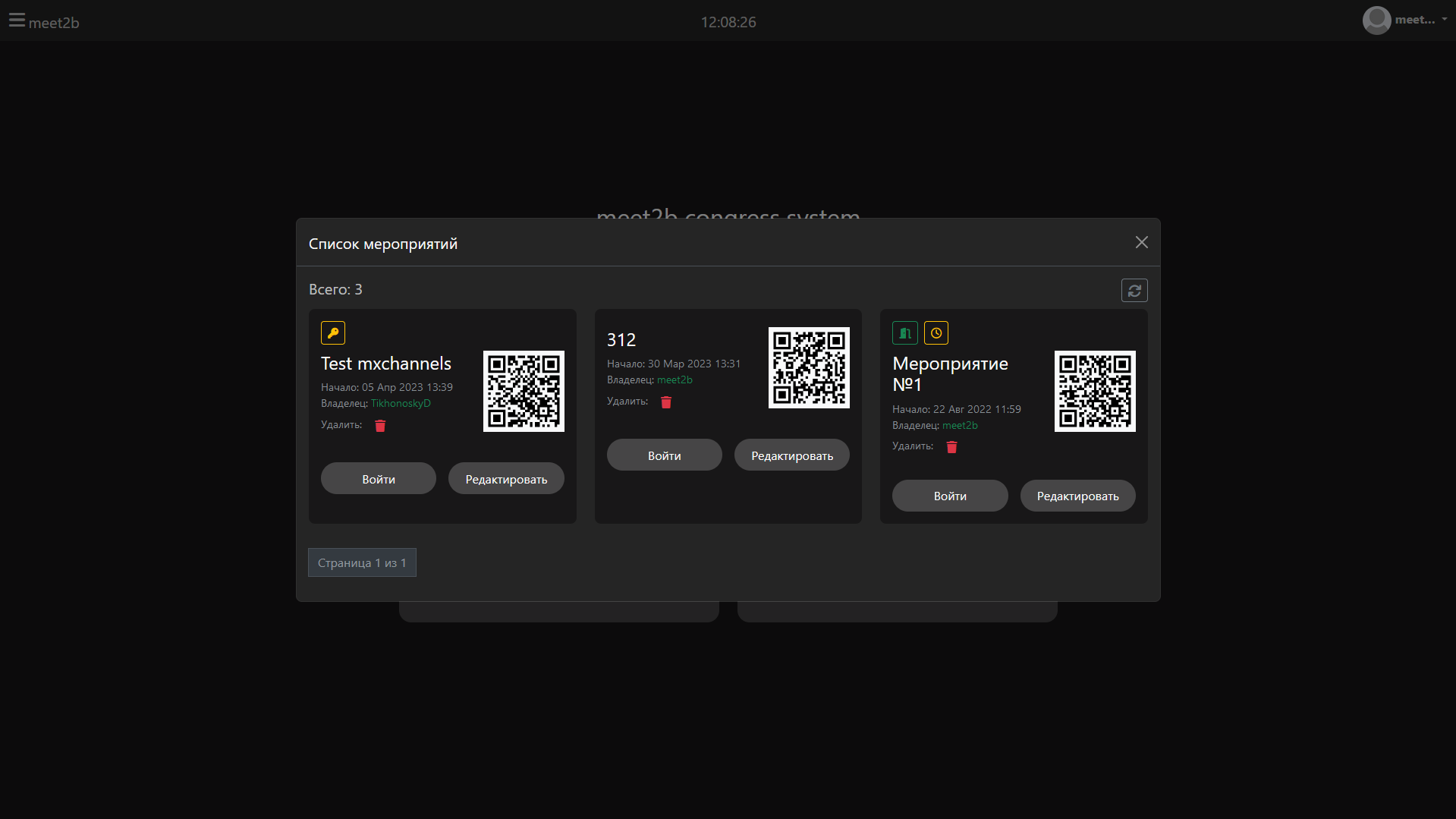 Список мероприятий доступен авторизованным в системе meet2b пользователям и позволяет входить в выбранное мероприятие. Для владельца мероприятия и суперпользователя доступна возможность редактирования и удаления мероприятия.