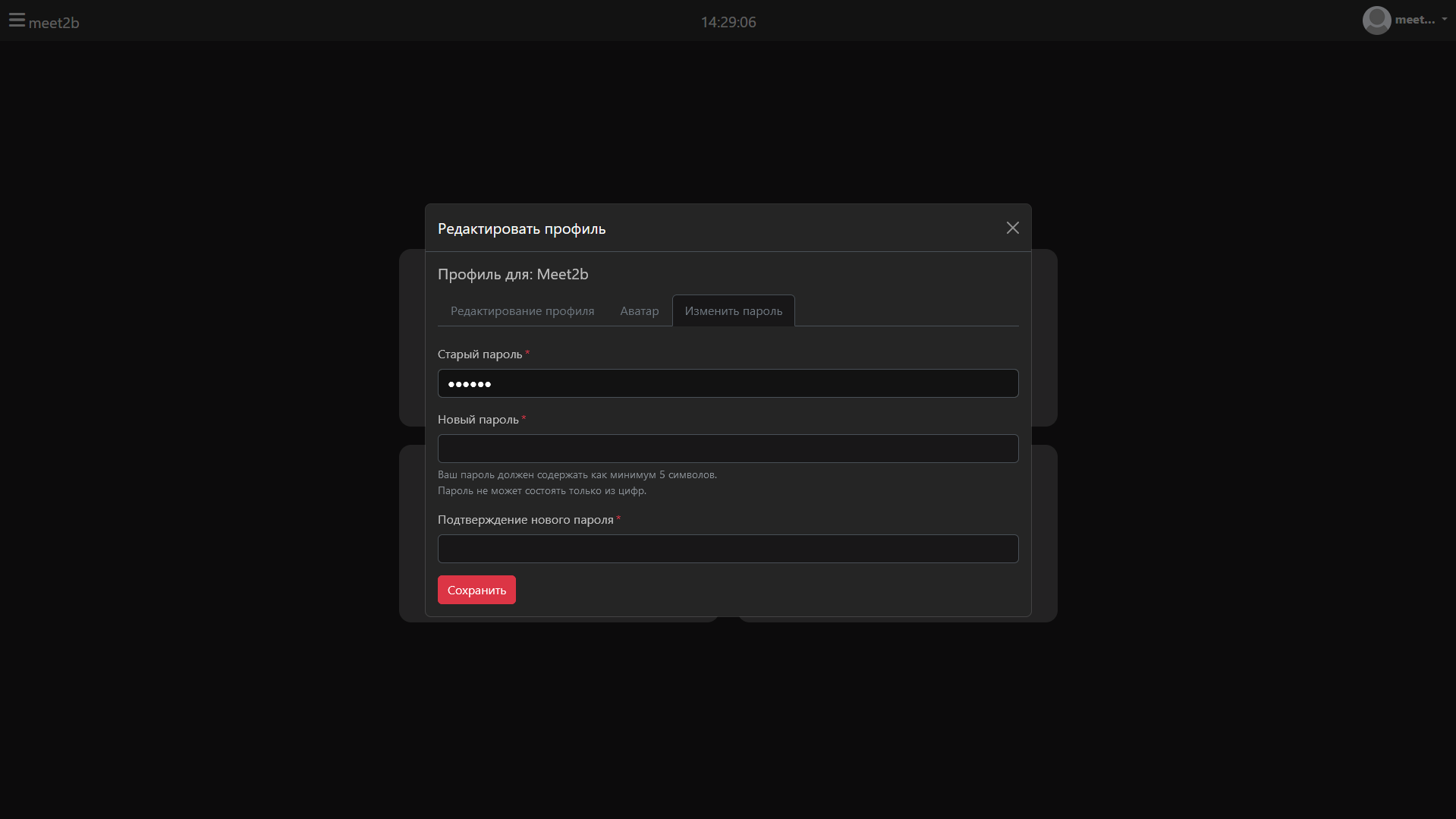 Для изменения пароля необходимо указать старый пароль, а затем ввести новый пароль и в поле Подтверждения ввести ещё раз новый пароль. Для подтверждения изменения необходимо нажать кнопку "Сохранить"