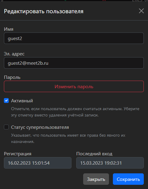 - Закрыть – закрыть окно редактирования пользователя без сохранения изменений