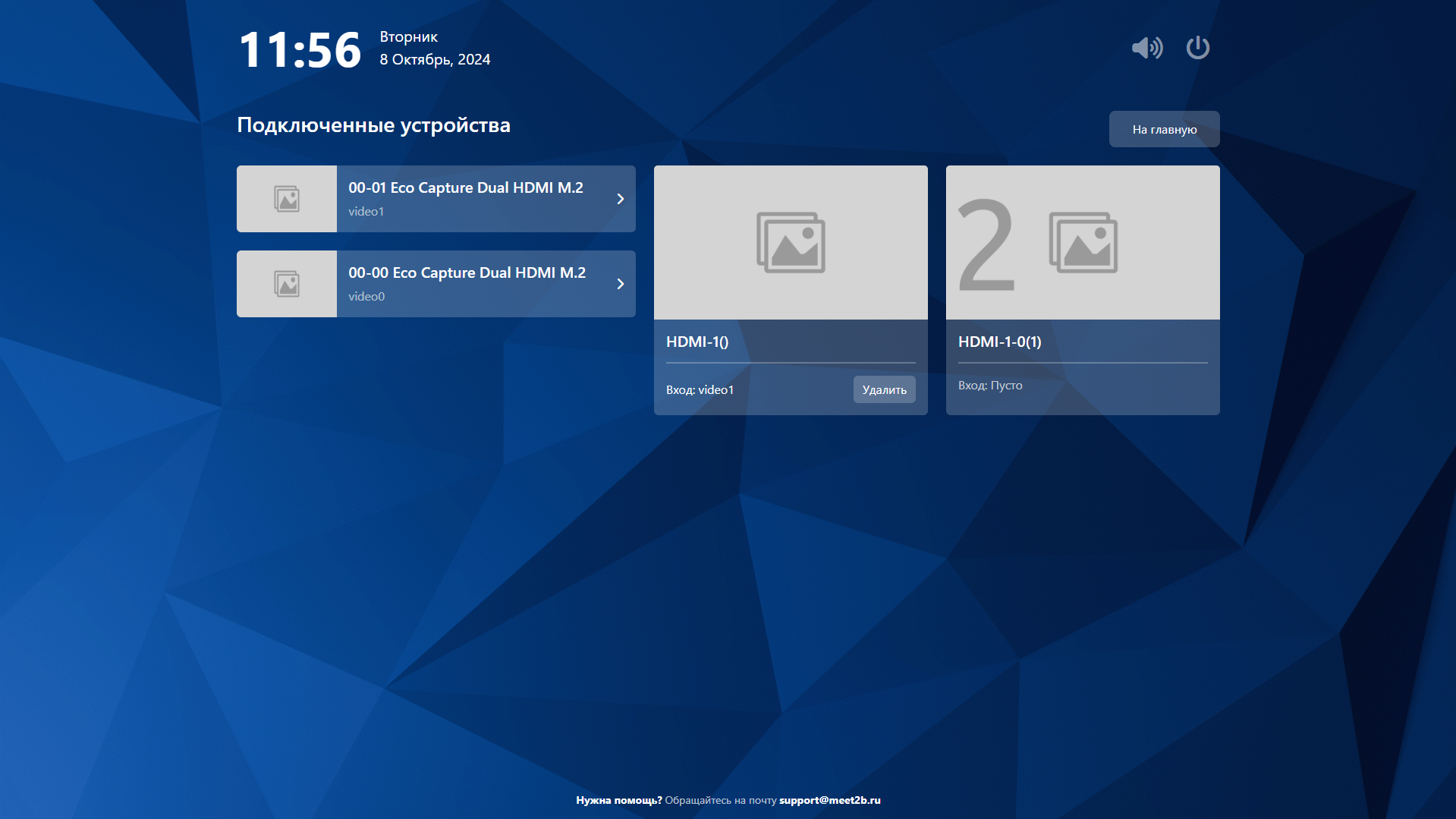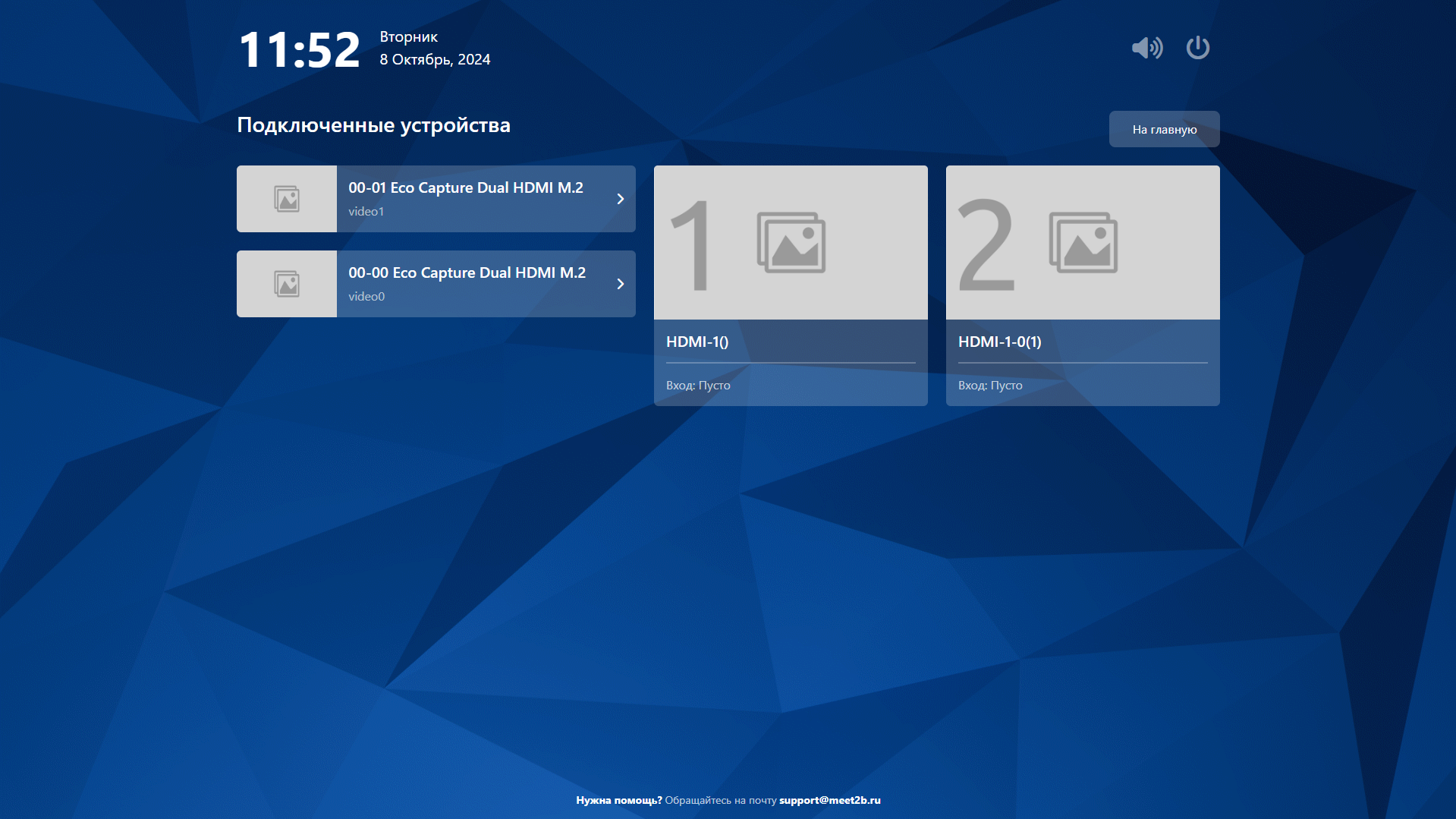 На странице Подключенные устройства представлен список всех подключенных источников к meet2b s. Страница разделена на левый и правый блок. Слева представлены все подключенные входы (платы захвата, камеры). Слева список подключенных выходов (дисплеев).