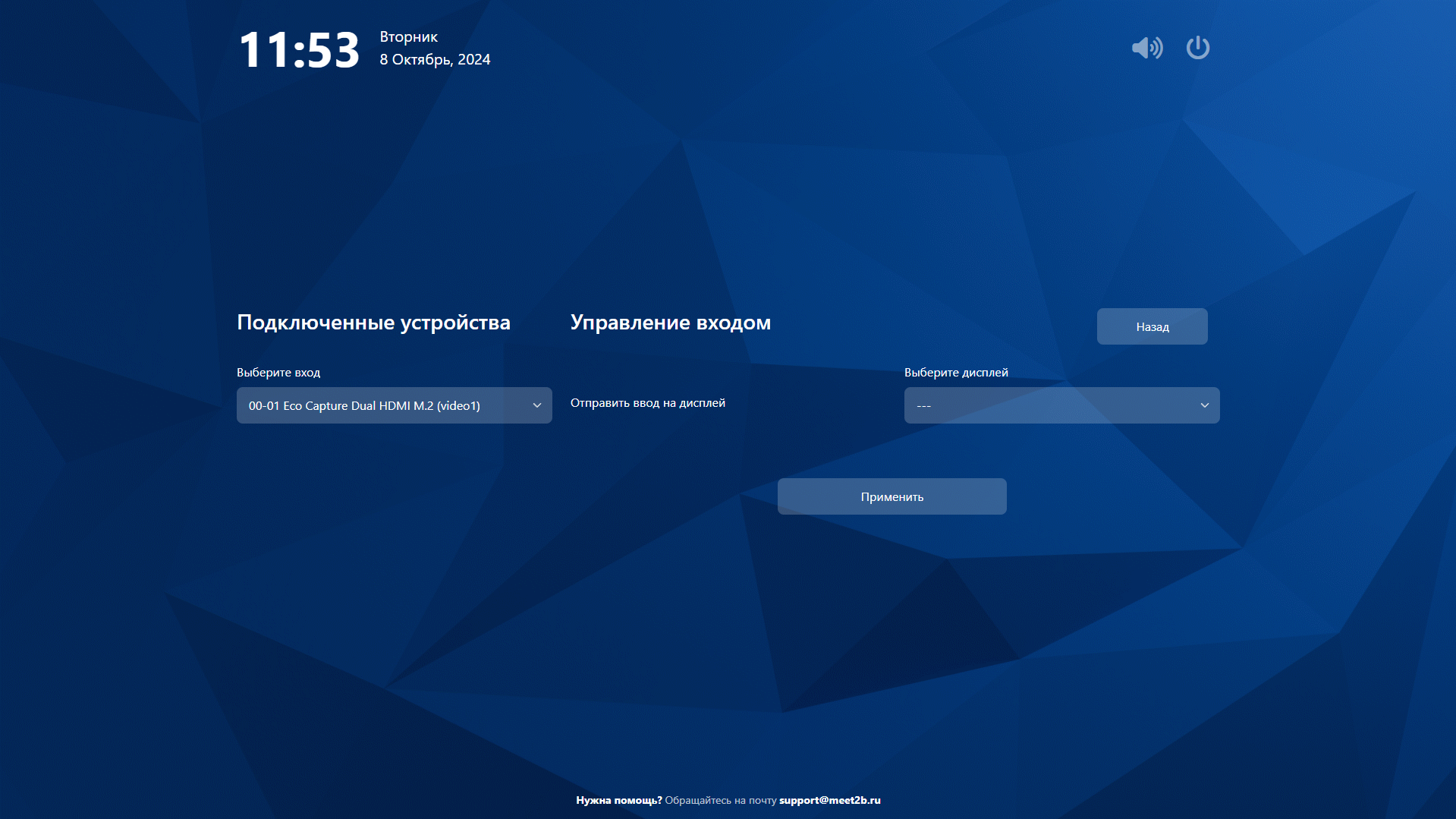 На данной странице присутствует функционал вывода какого-либо входа (камеры) на какой-либо выход (дисплей). Для данного действия необходимо выбрать слева вход и совершить нажатие на него (пультом или мышкой), откроется страница с выбором выхода (дисплея), на который необходимо сделать вывод входа. После подтверждения источник отобразиться на выбранном дисплее.