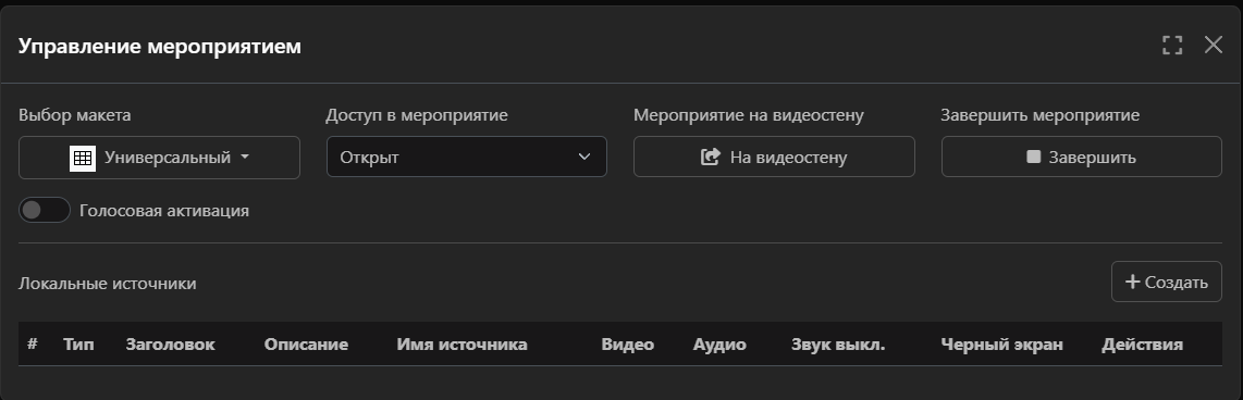 - Локальные источники - позволяет добавлять внутрь мероприятия несколько видов источников (только при активной настройке мероприятия "В переговорной").