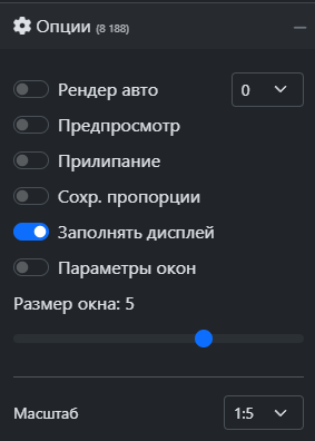 Функция позволяет при перетаскивании и добавлении нового окна в макет автоматически растянуть окно на всю высоту и ширину дисплея, тем самым заполнить его полностью. Для включения необходимо активировать переключатель на странице "Процессор" в блоке "Опции".