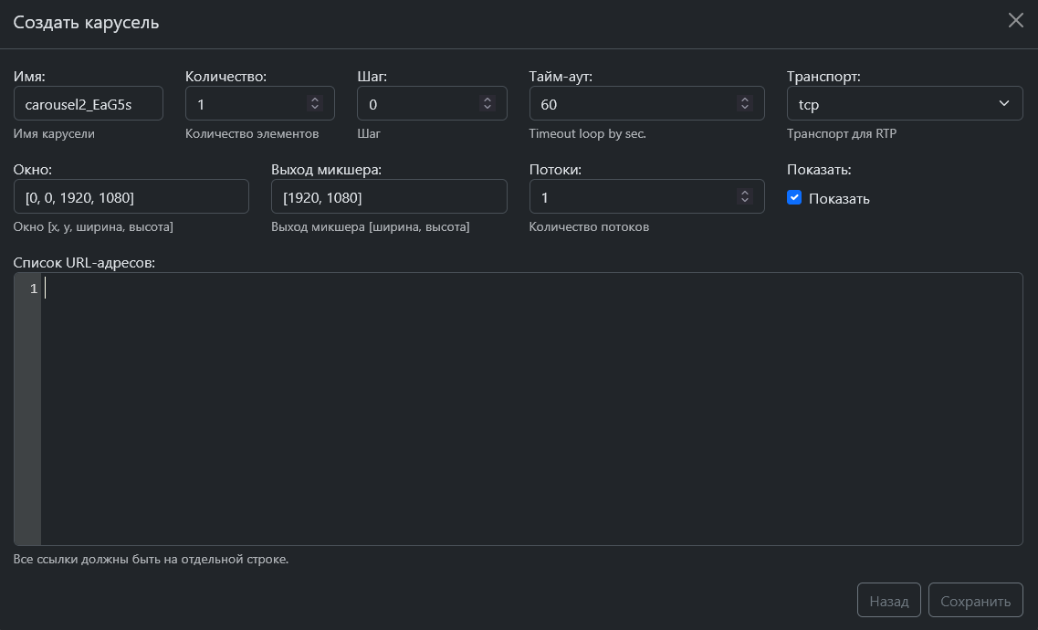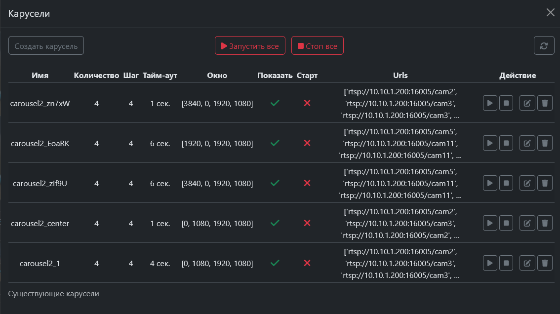 При создании карусели необходимо соблюдать кратность количества источников, чтобы при их смене не возникало пустых пространств. Если данное условие соблюсти невозможно, то при заполнении URL необходимо добавлять «пустые» строки, которые автоматически будут представлены в окне в виде «blackscreen» для источника.Для запуска или остановки карусели необходимо использовать специальные кнопки.