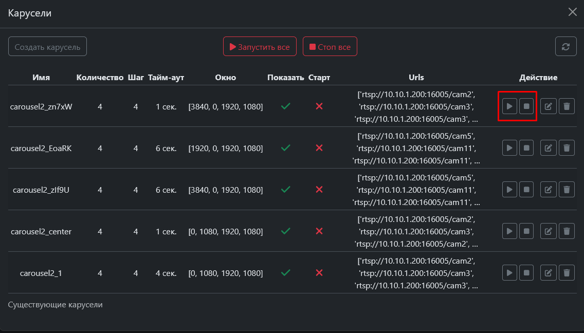Если присутствует несколько каруселей, которые необходимо запустить, то сделать это можно с помощью кнопки «Запустить всё» или «Стоп всё» для остановки сразу всех каруселей.