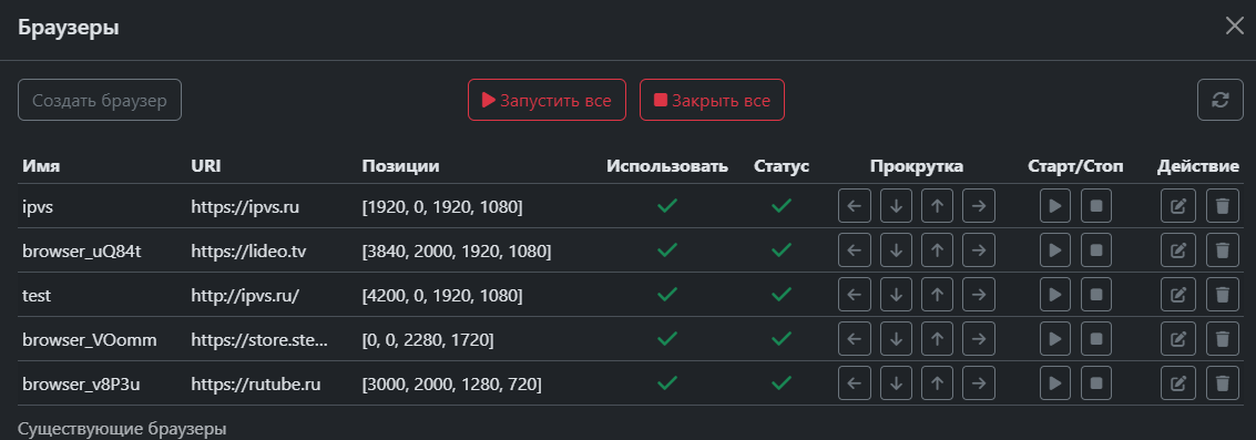 Если ни один браузер не выводится в данный момент, то необходимо нажать кнопку «Запустить всё». Неактивные браузеры можно удалить через кнопку удаления. Для завершения работы с браузерами необходимо нажать кнопку «Закрыть всё» .