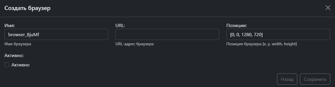После нажатия кнопки «Создать браузер» открывается модальное окно, в котором необходимо заполнить поля.