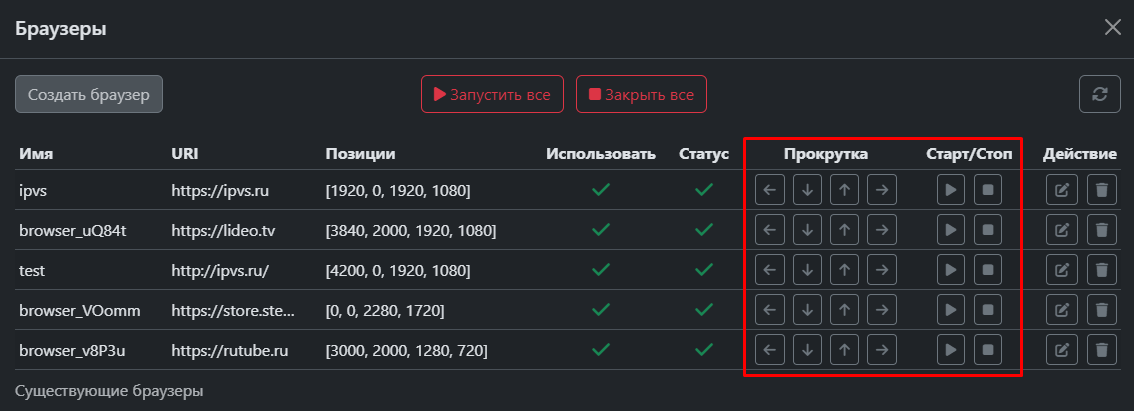 - Позиции – для отображения браузера необходимо относительно координат и размеров видеостены задать значения (x, y, ширина, высота)